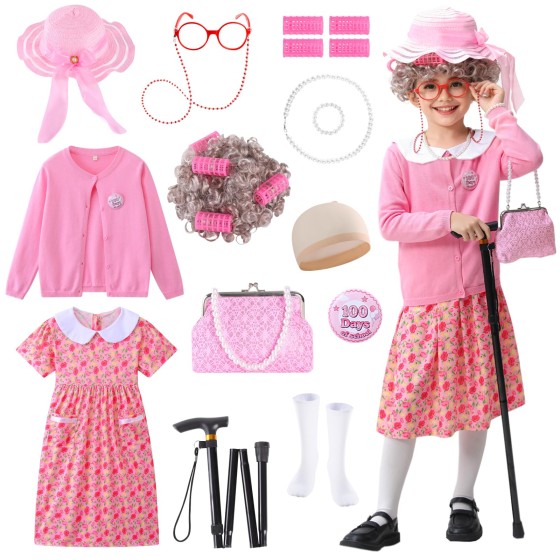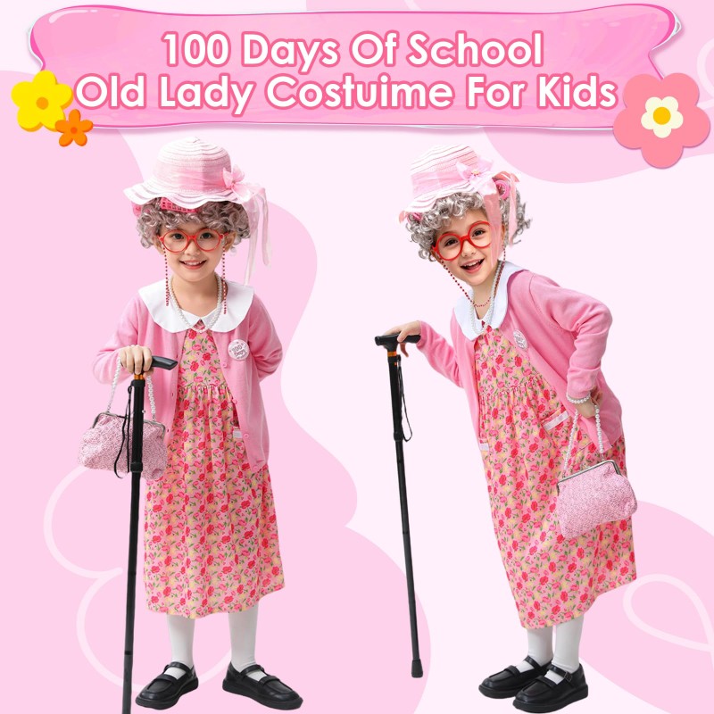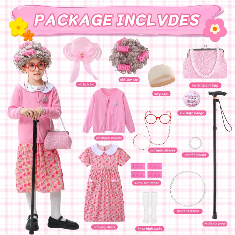 • ZelJoyla Deluxe old lady costume set:100 days of school costume for kids Includes 13pcs:old lady wig (and the Included Wig Cap and curling wand),old lady dress,cardigan sweater,old lady hat,old lady glasses,pearl necklace and bracelets,foldable cane,knee-high socks, purse,100 days badge.A wide variety of accessories are available for childrens to freely combine
