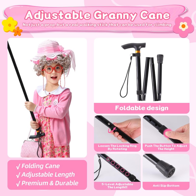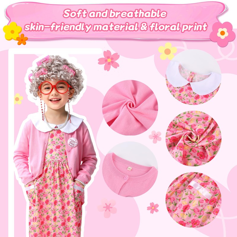 • Old Lady Costume for Kids:Comfortable and Safe for All Day Wear Crafted with quality in mind,the wig features realistic synthetic fiber,while the dress and cardigan are made from soft,breathable blended cotton.Comfortable enough for all-day events at school,and it is also suitable for everyday wear